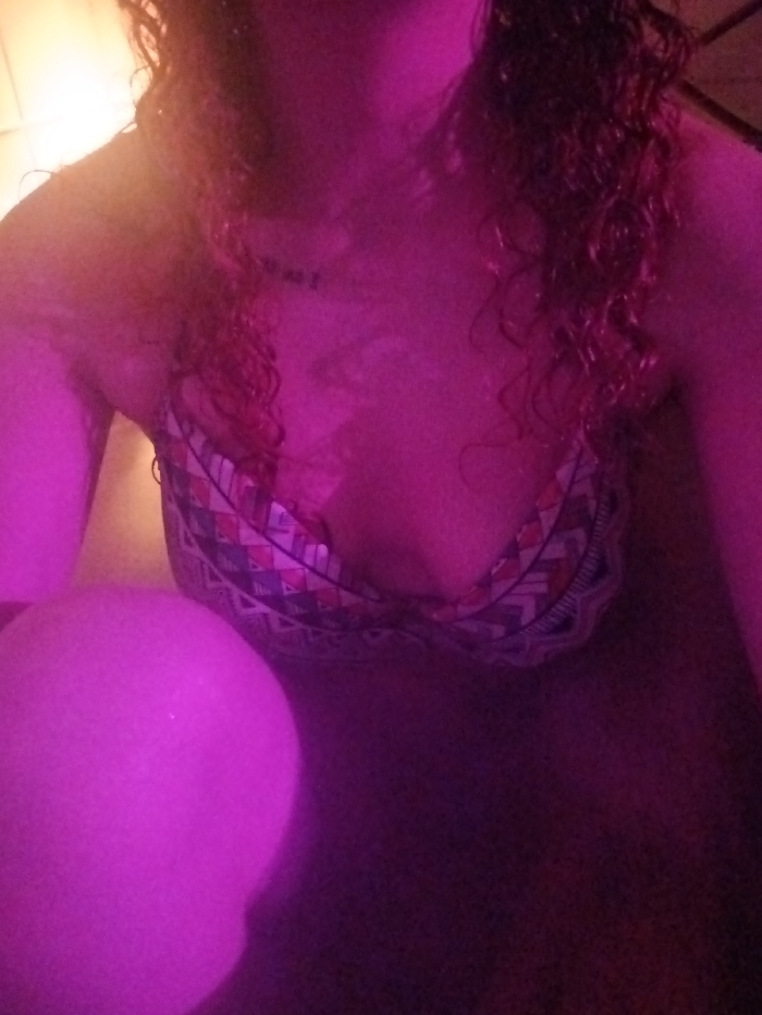 woman's torso and shoulders. She is wearing a patterned bikini top. Her curly hair is visible around her shoulders. A soft pink light illuminates the scene, casting shadows on her skin. A round object is on her chest. The lighting makes it difficult to discern details.