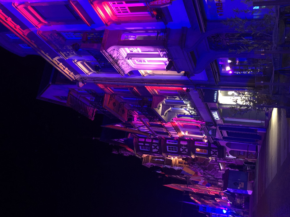 Buildings illuminated with purple and red lights line a street at night. Shop signs, like “CAROLL,” are visible. Balconies and intricate architectural details are highlighted by the colorful lighting. Plants add a natural element to the urban scene. The sky is dark.