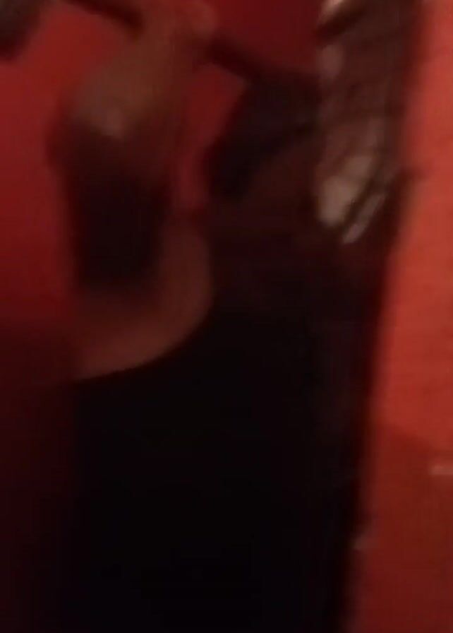 person on a red surface, possibly a bed or couch, with a black object and a checkered pattern visible in the background. The person's arm is visible, and they appear to be holding a cylindrical object with a metallic or shiny finish. The lighting is dim, making it difficult to discern details clearly.