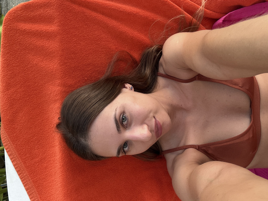- "A young adult female with light skin, long brown hair, and blue-green eyes is depicted in a close-up selfie, lying face-up on a bright orange towel" by FM-gu4Nv1, licensed under CC BY 4.0