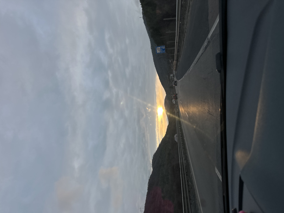 The image depicts a multi-lane highway scene near Potop, Bulgaria, at what appears to be sunrise or sunset. The perspective is from inside a vehicle, with the top of the dark-colored dashboard visible at the bottom of the frame. The highway extends forward, curving slightly towards the right, with solid and dashed white lane markings visible on the asphalt. The road surface reflects a bright golden glare from a low sun positioned on the horizon between two forested hills. These hills, covered with trees, flank both sides of the highway. The sky overhead is largely overcast with grey clouds, though the sun breaks through, casting prominent rays. Multiple vehicles, predominantly passenger cars, are observed traveling in the same direction on the highway ahead. A metal guardrail runs along both edges of the road. On the right side, a blue road sign with white pictograms, indicating a merging lane or exit, is visible. No specific individuals are discernible.