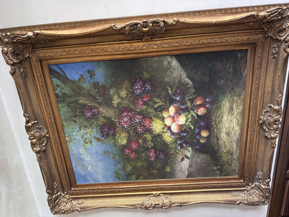 A large, vertically oriented oil painting depicting a still life of fruit and a natural scene is mounted on a light-colored wall in Blagoevgrad, Bulgaria