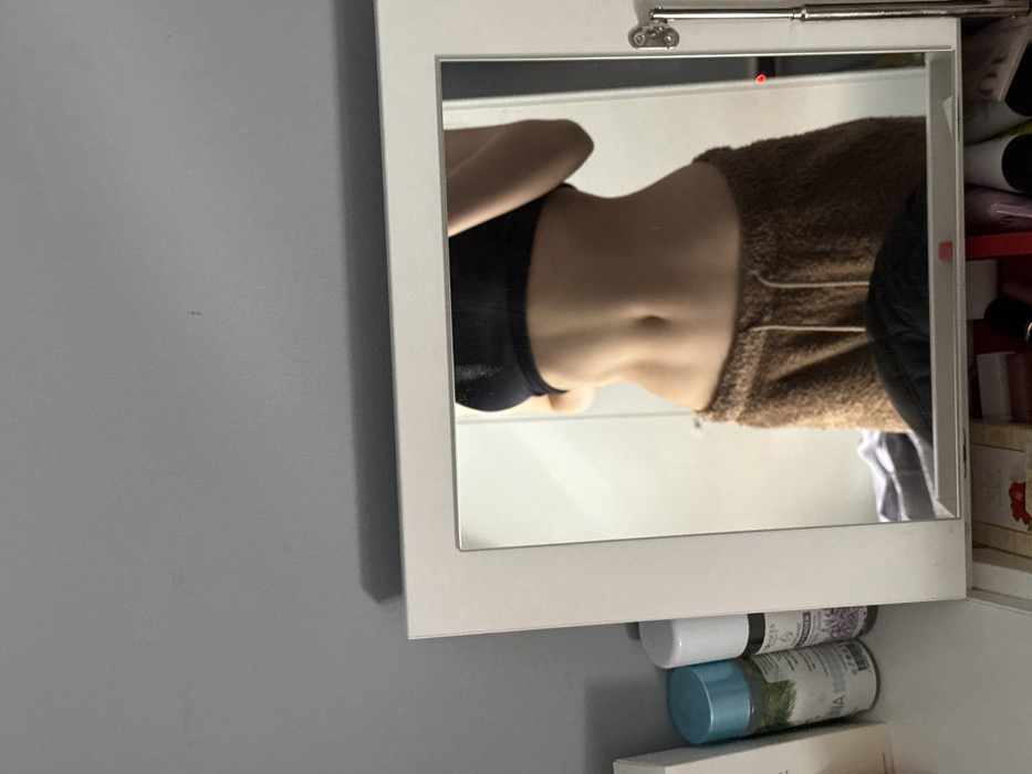 The image depicts an indoor scene, observed as a mirror reflection. The central subject is an individual's torso, viewed from the waist up, captured in a white-framed mirror. The person is wearing a black sports bra or crop top and brown, textured, drawstring sweatpants, revealing their midriff with a visible navel and abdominal contours. To the immediate left of the mirror, on a white surface, two bottles are visible: one light blue/green bottle partially labeled, possibly "SANTORINI," and a white bottle with a purple label, partially reading "ESSENCES LAVENDER." Further left, a white rectangular object is partially visible. The wall behind the mirror and the surface to its left is a plain grey. Below the mirror, an open drawer or shelf contains various small personal items, including a black, possibly quilted, object and several items with red and white packaging. A small red light or indicator is visible on the inner right frame of the mirror, which also features a metallic hinge mechanism on its right side, suggesting it may be a cabinet door. The reflection within the mirror shows a light-colored background behind the individual, possibly a wall or door. Interior lighting creates a distinct shadow line on the grey wall above the mirror. The location is stated as a city in Sofia, Bulgaria; however, no visual elements within the image itself provide geographical identifiers for this city.