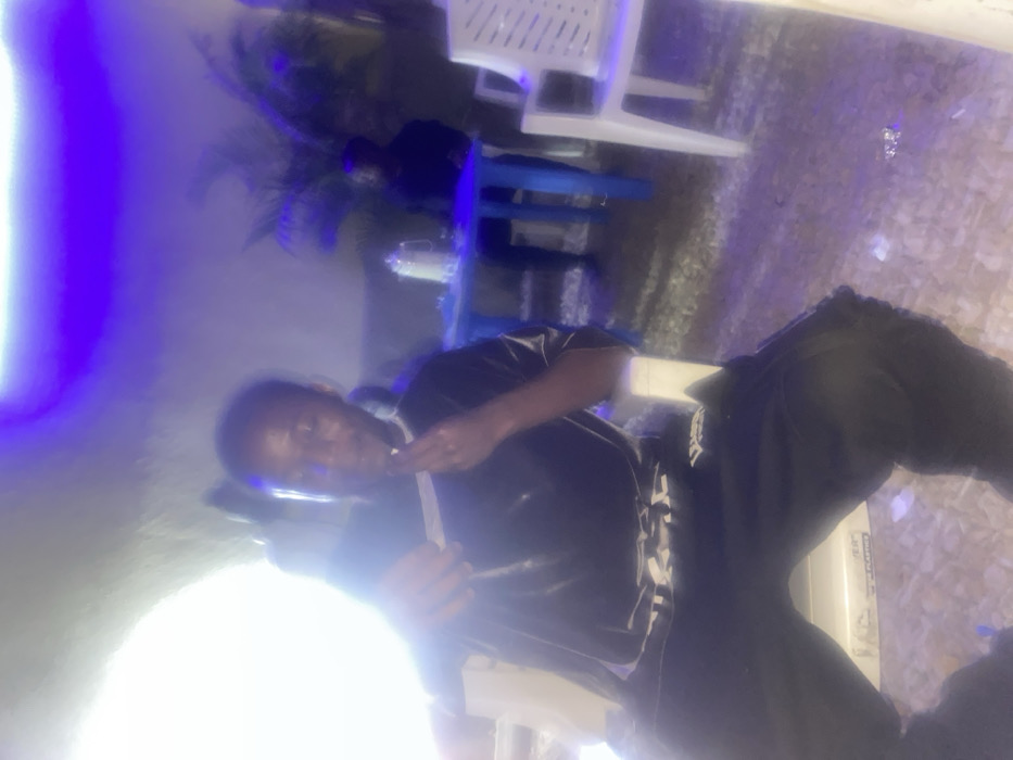 A man in dark clothing sits outdoors. A bright light washes out the image, partially obscuring him. He appears to be holding something in his hands. In the background, a white plastic chair and a blue table can be seen, along with another person in the distance. The overall scene seems to be at night or in a dimly lit area, with light sources creating blurriness. The ground appears to be textured with a mix of light and dark tones.