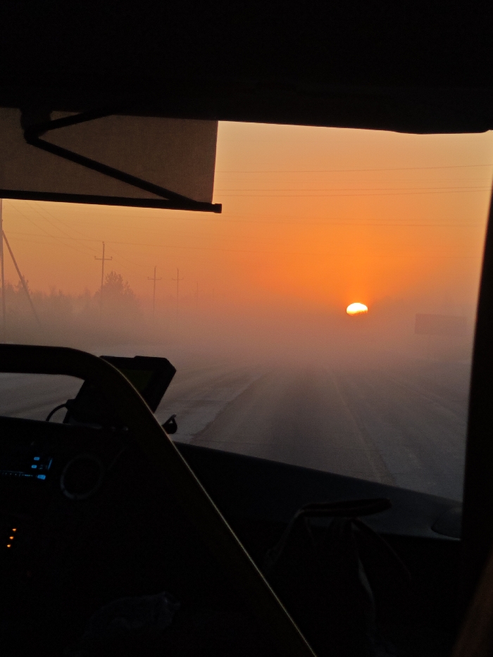 The image depicts a rural or semi-rural road scene at sunrise or sunset, viewed from inside a vehicle in the city of Unknown, Russia