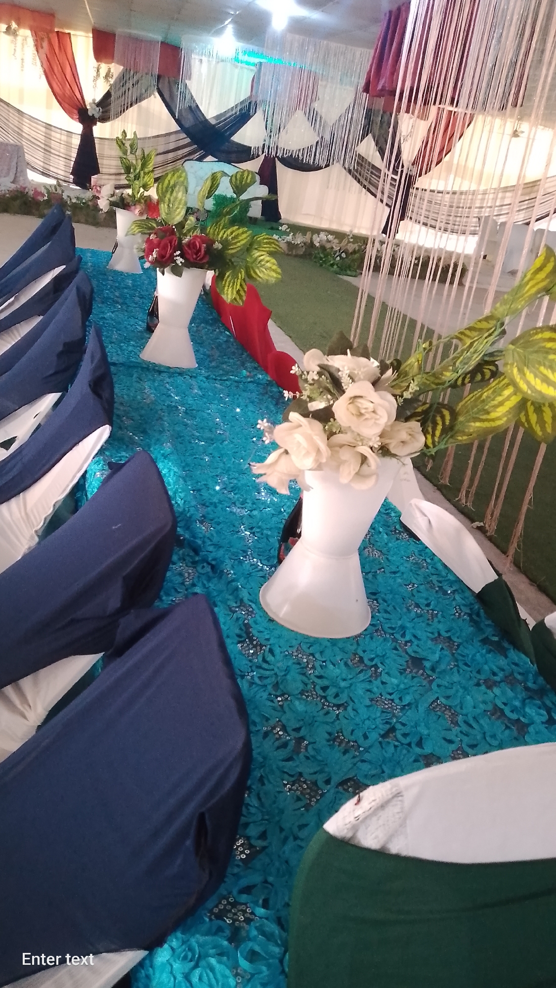An indoor event space in Gudi, Nigeria, is decorated for a gathering. The scene features a long table, oriented diagonally from left to right foreground, covered with a bright turquoise tablecloth displaying a floral lace pattern with sequins. Along the table, multiple white, hourglass-shaped vases hold arrangements of artificial flowers, including red roses, white roses, and various green foliage. Red and dark green fabric accents are draped at intervals along the table's edges. Adjacent to the table, chairs are visible, covered in dark blue fabric with white undersides. The background shows walls draped with fabric in alternating sections of white, black, and maroon/red, creating a pleated or swagged effect. Numerous thin, white, string-like decorations hang vertically from the ceiling in the midground and background, forming translucent curtains. The floor in the background is covered with artificial green turf. Overhead lighting fixtures are visible on the ceiling. No individuals are present or engaged in any actions within the frame.