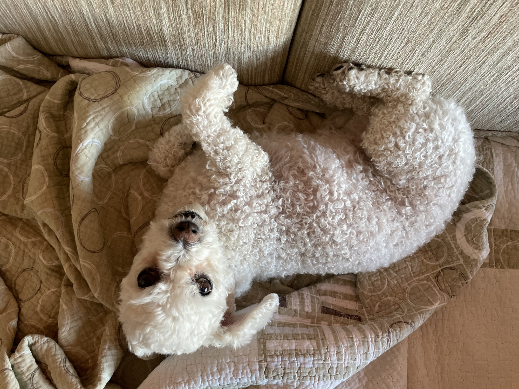 A white, curly-haired dog lies on its back on a patterned blanket. The blanket is on a tan couch. The location is not discernible from the image, and it is not possible to determine if the photo was taken in Yekaterinburg, Russia.
