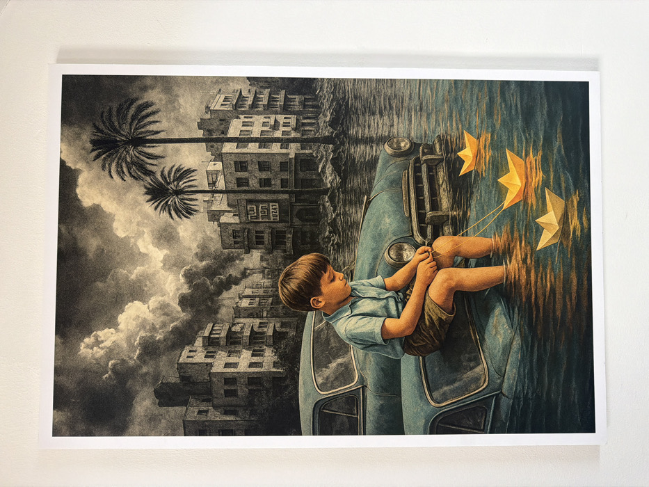 The image depicts an urban street in Tel-Aviv, Israel, submerged in floodwaters under a heavily overcast sky. In the foreground, a young boy with brown hair, dressed in a light blue collared shirt and brown shorts, sits on the front fender of a partially submerged light blue vintage car. His lower legs are immersed in the water. He is focused on manipulating strings attached to two small, yellow paper boats floating directly in front of him. A third yellow paper boat floats slightly further away. In the mid-ground, another, more deeply submerged, light blue vintage car is visible beneath the one the boy sits on. Behind the vehicles, the street is completely inundated, with water extending to the lower levels of multi-story buildings that line the street. Several buildings show signs of wear or damage. One building in the mid-right background features a sign with Hebrew text, reading "תל אביב" (Tel Aviv) and "10241". Two tall palm trees rise prominently from the flooded environment in the mid-ground. Dark plumes of smoke ascend from behind structures on the left side of the background, suggesting fire or ongoing events. The overall scene blends a monochromatic, desaturated background with selective color in the foreground elements.