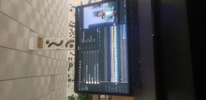 An indoor scene in Enugu, Nigeria, features a dark-colored laptop computer positioned centrally on a dark, flat surface, presumably a desk. The laptop screen displays video editing software, showing multiple project files and folders on the left panel, a video timeline with various tracks and thumbnails across the bottom-middle section, and a video preview window on the right. The video preview depicts a male subject, an adult, dressed in a light-colored suit jacket (appearing grey/blue), a white collared shirt, and a dark tie, seated with his hands clasped. The background of the video shows blurred elements, possibly framed art and distant buildings. Behind the laptop, a light-colored wall with abstract black and white graffiti-style patterns is visible; one legible element reads "#BUDA." A white vertical pillar with similar abstract patterns and a small wooden shelf is partially visible to the right. A green plant in a light brown pot is situated on the left, behind the laptop. The ceiling above consists of light-colored square tiles. No individuals are visible directly interacting with the laptop.