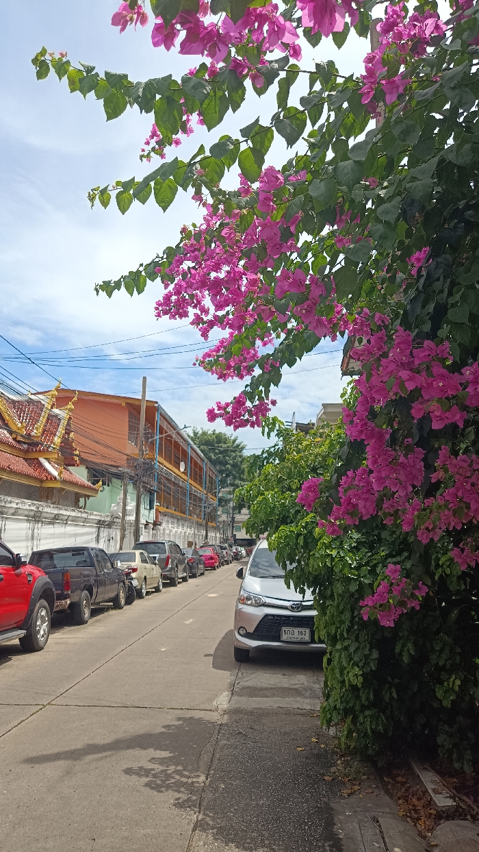 The image displays an urban street scene in Bangkok, Thailand, situated alongside a Buddhist temple (Wat) under a partly cloudy sky. A dense bougainvillea bush with numerous pink flowers and green foliage occupies the right foreground and midground, partially obscuring the street view. A concrete sidewalk extends from the lower left foreground. A line of vehicles is parked along the left curb of a paved, two-lane street that recedes into the background. These include, from left to right, a red Ford Ranger pickup truck, a dark-colored pickup truck, and several sedans. On the right side of the street, a silver Toyota Avanza, bearing the Thai license plate '6กฉ 160', is parked partially behind the bougainvillea. To the left of the street, a white wall topped with the distinctive ornate, gilded roof of a Thai temple is clearly visible. Behind this wall, an orange multi-story building with blue-framed balconies and a dense network of utility wires strung across poles are present. Further urban structures and trees line the distant background. No individuals are visible in the scene.