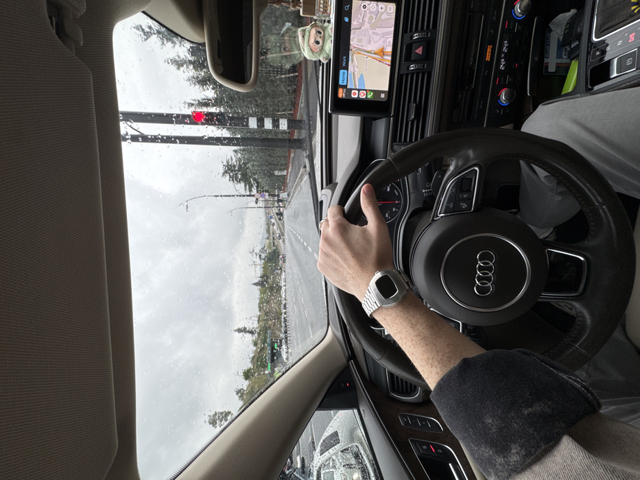 The image depicts the interior of an Audi vehicle, specifically from the driver's perspective, looking out through a rain-splattered windshield on an overcast day. A person's right arm, wearing a silver-toned, rectangular digital watch on the left wrist and a ring on the right ring finger, is positioned on the dark leather steering wheel, which bears the Audi logo. The driver's visible arm displays numerous freckles. The driver is wearing a light-colored garment with dark sleeves and grey trousers. Inside the vehicle, the dashboard is visible, featuring an infotainment screen on the right displaying a map application with "Home" and "Work" tabs, along with a 5G signal indicator. Below the screen are climate control vents and a digital display showing "24°C". A small green figurine is situated on the dashboard near the base of the windshield. A rearview mirror is also visible. Outside the vehicle, a wet, multi-lane asphalt road extends into the distance. A red traffic light is prominently visible on the right side of the road, mounted on a black and white striped pole. Other vehicles are present on the road, including a silver car positioned to the left of the driver's vehicle. The roadside features trees, green foliage, and streetlights. In the background on the left, a green-colored sign and what appears to be a commercial establishment or gas station are partially visible behind a white barrier. The sky is uniformly overcast. The scene is located in the city of Unknown, Unknown.