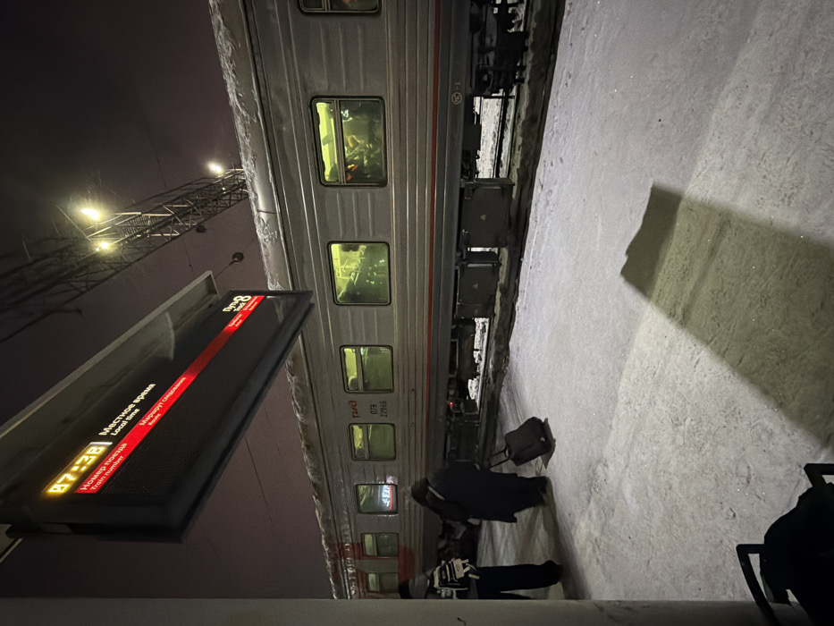 A nighttime shot at a train station depicts a silver train stopped at a snow-covered platform. Passengers board with luggage. An electronic sign displays the time as 87:381 and train route information. Overhead, a metal structure with lights illuminates the scene. Long shadows stretch across the snowy ground, adding depth to the image.