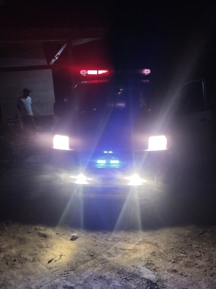 In a dark setting, an ambulance illuminates its surroundings with bright headlights and red emergency lights on the roof. The ground in front of the vehicle is uneven and partly lit by the headlights. A man stands near the ambulance, appearing to be looking towards the vehicle. The scene conveys a sense of urgency and emergency response.
