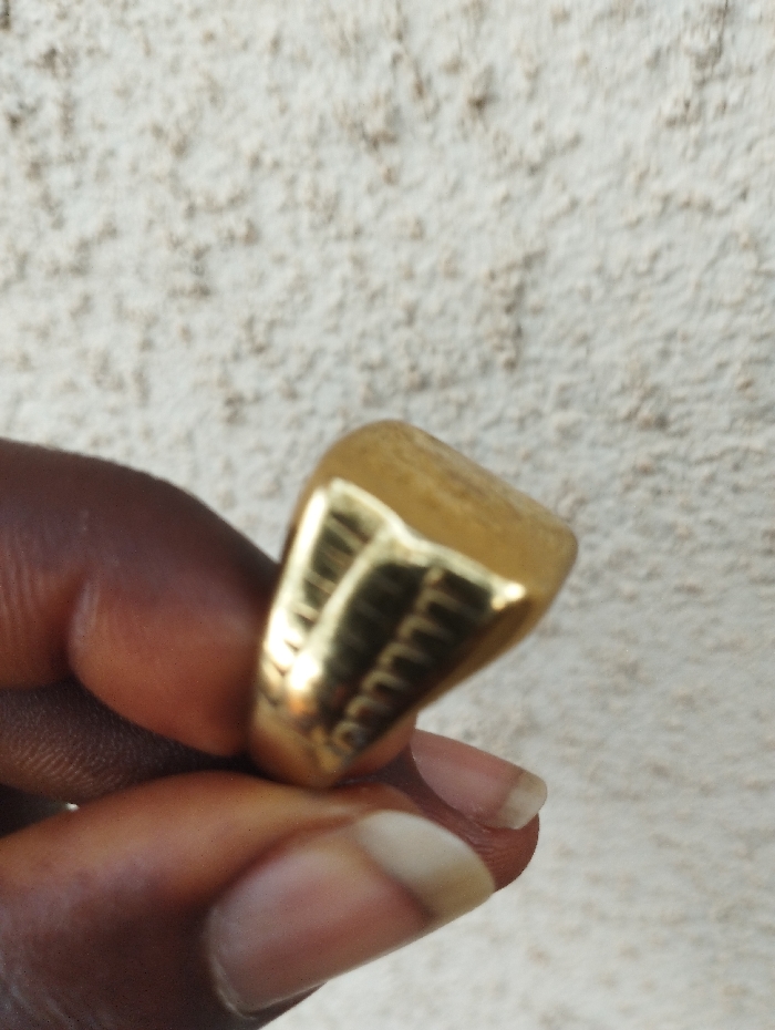 A close-up photograph displays a dark-skinned human hand holding a gold-colored signet ring