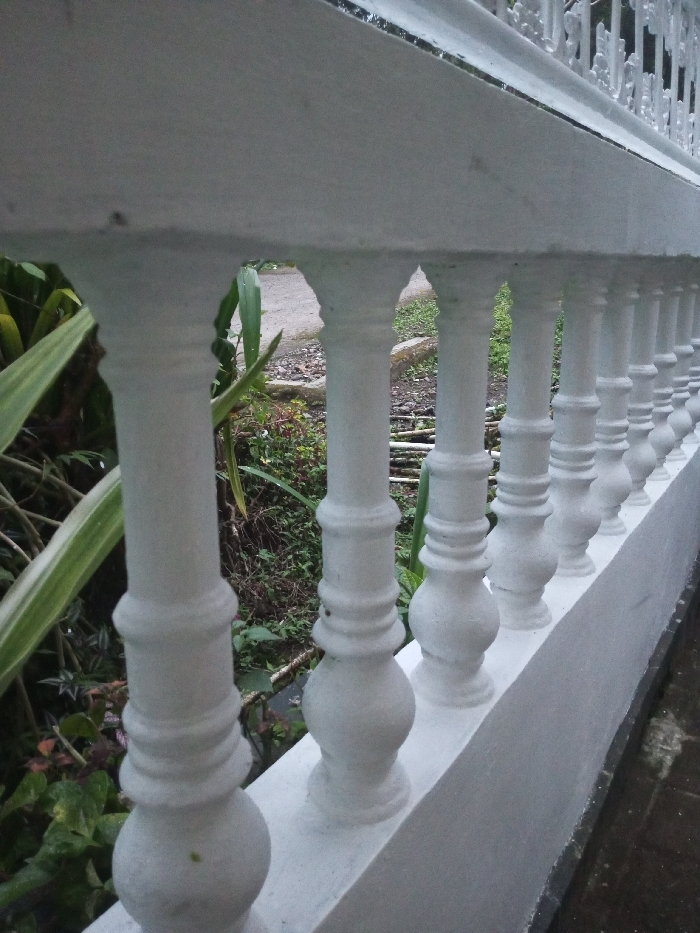 The scene depicts a white concrete balustrade viewed at an angle, extending from the left foreground towards the right midground within the city of B. Nam Ngao, Laos. The balustrade consists of numerous identically shaped balusters, each featuring a bulbous base, a central ring, and a tapered upper section, supporting a flat, solid concrete top rail. A lower concrete ledge forms the base of the structure. The surfaces of the concrete appear clean and uniformly white, with some areas exhibiting a slightly granular texture. Through the gaps between the balusters, an outdoor environment is visible. This background includes dense green foliage on the left, featuring broad leaves and various shrubs. Towards the right and further back, an unpaved pathway or ground area with exposed earth and gravel is discernible, leading to more vegetation beyond. The overall lighting is soft and diffuse, suggesting an overcast day or post-rain conditions, with some surfaces appearing damp. No individuals, animals, or active interactions are present in the image.