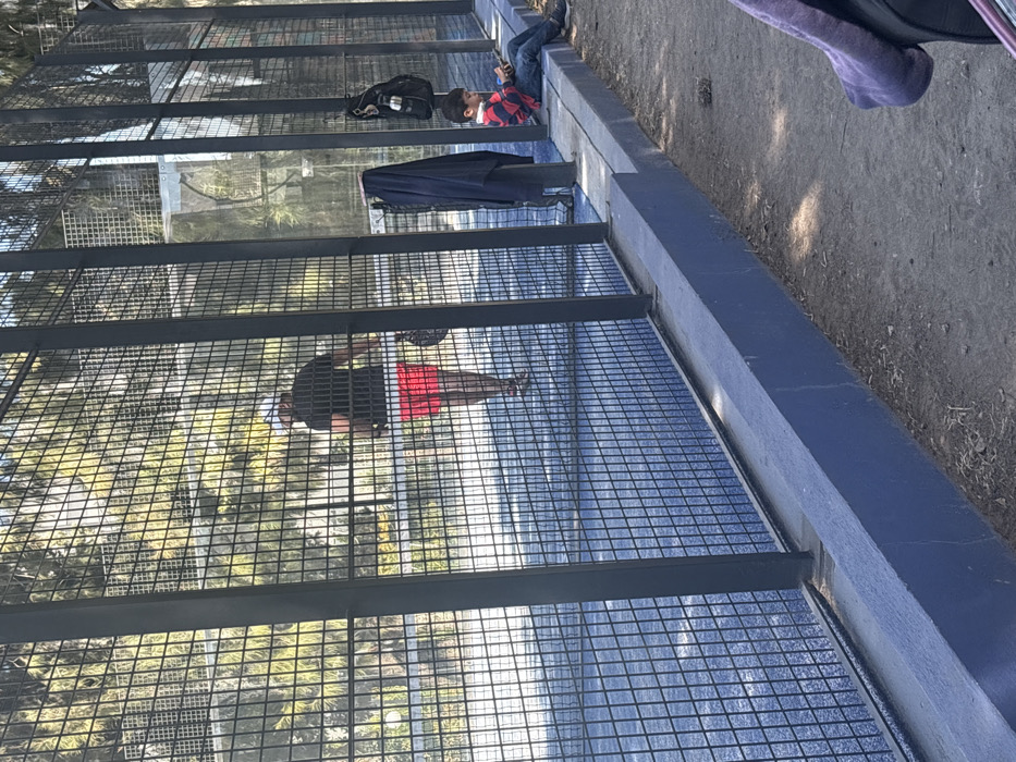 An elevated metal mesh walkway spans a considerable distance, with individuals walking across it. Trees are visible below the walkway, creating a sense of height. One person is seated on the edge, while another is walking. A backpack and a dark jacket are also present on the walkway. The perspective creates a slightly disorienting view, showcasing both the ground below and the activity on the walkway.