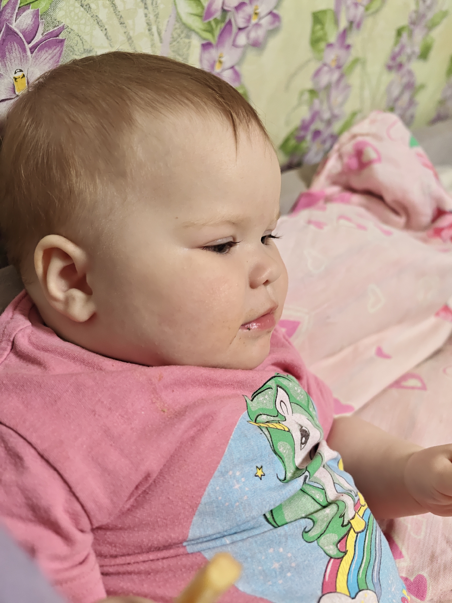 A baby is lying on a pink blanket with a pink shirt adorned with a My Little Pony design. The baby has fair skin, light brown hair, and is looking to the right. Food residue is visible around the baby's mouth. The background consists of a patterned fabric with floral designs. The location is possibly near the city of Уральское, Russia.