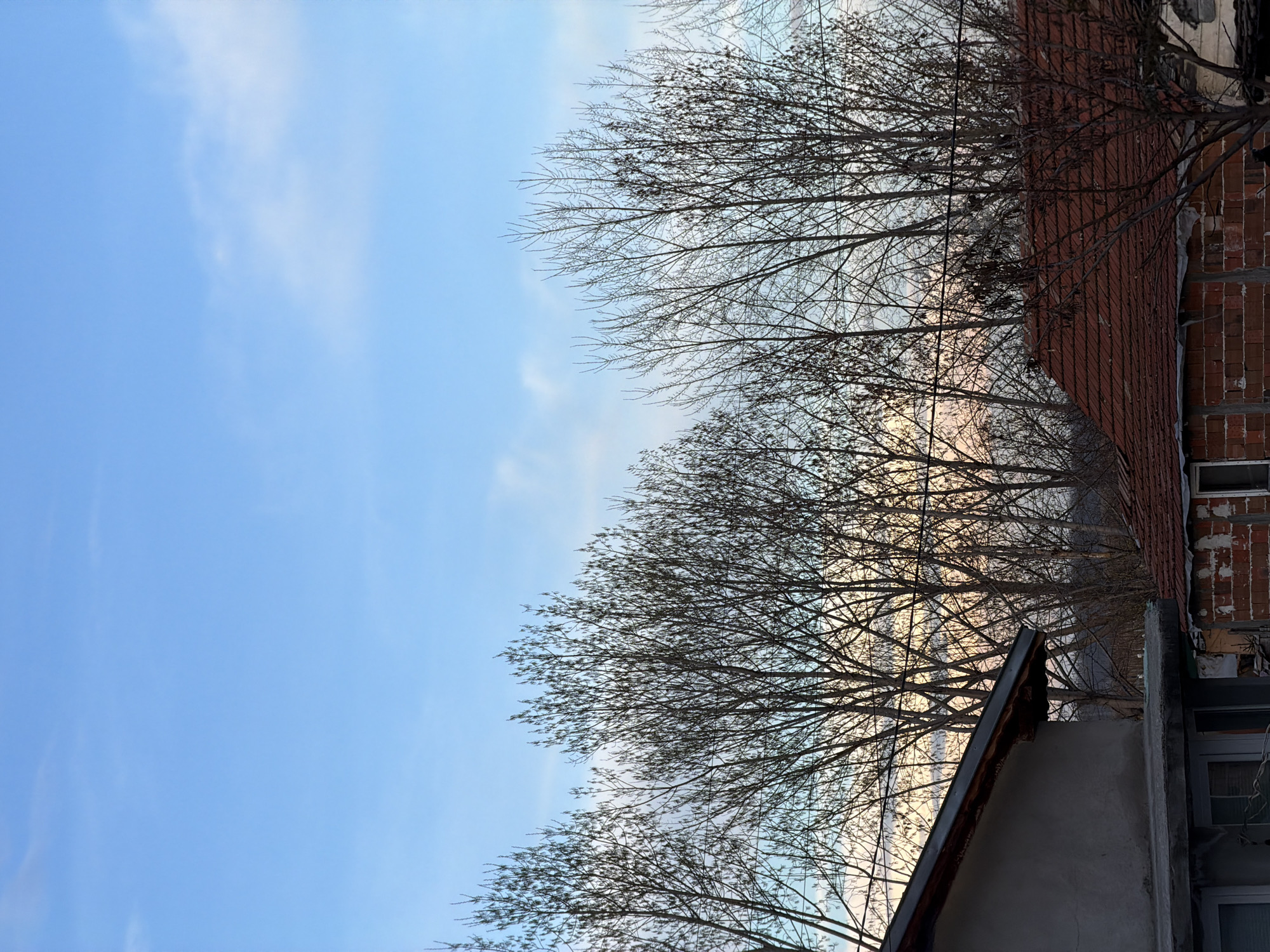 - "The photograph depicts a clear, pale blue sky with wispy clouds, juxtaposed with bare tree branches and a brick building" by FM-N7znO2, licensed under CC BY 4.0