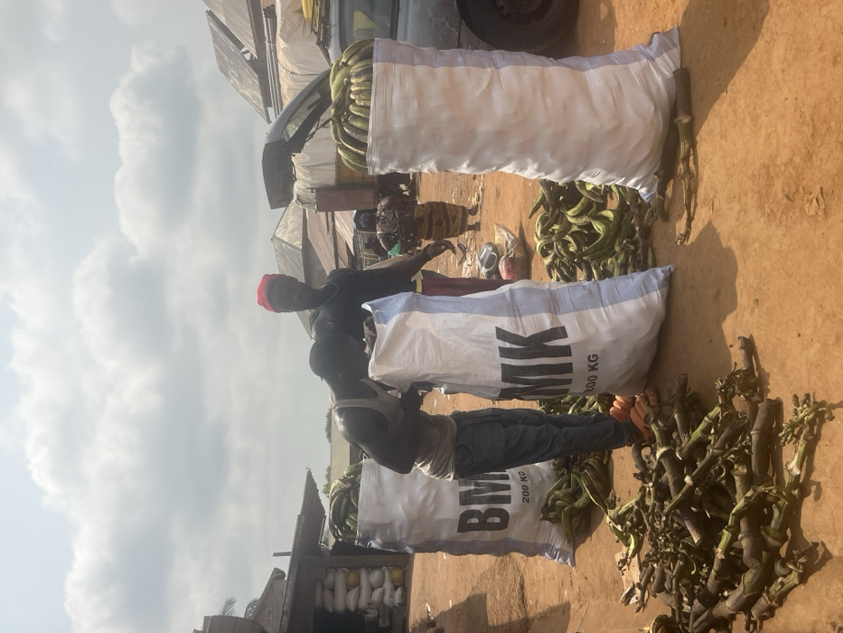 Two individuals are shown in a partially outdoor setting, presumably a marketplace. They appear to be dealing with agricultural produce, specifically plantains, as evidenced by numerous bunches scattered around and packed into large white bags labelled "BMK 200 KG." One person is wearing a red cap and a dark shirt, while the other is wearing a white tank top. The ground is dirt, with discarded plantain stalks littering the area. A vehicle is parked in the background.