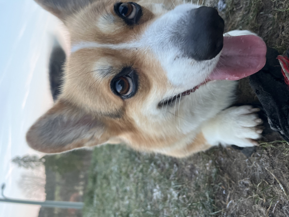 - "This outdoor image presents a close-up, eye-level perspective of a tricolor Corgi dog" by FM-4GKkh1, licensed under CC BY 4.0