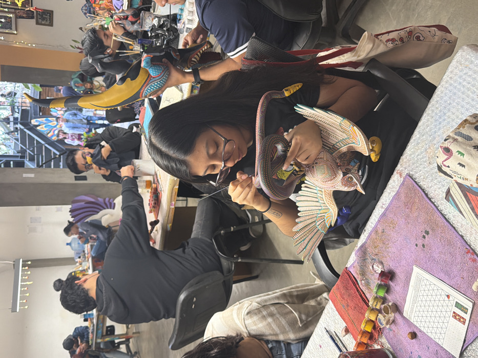 A group of people are engaged in crafting alebrijes, intricate Mexican folk art sculptures. A woman in the foreground focuses intently on painting a wooden bird-like figure, while a serpent-shaped alebrije rests beside her. Other individuals around the room are working on different pieces, with various painted figures and craft supplies scattered on the tables. The scene suggests an art workshop or a collaborative crafting session.