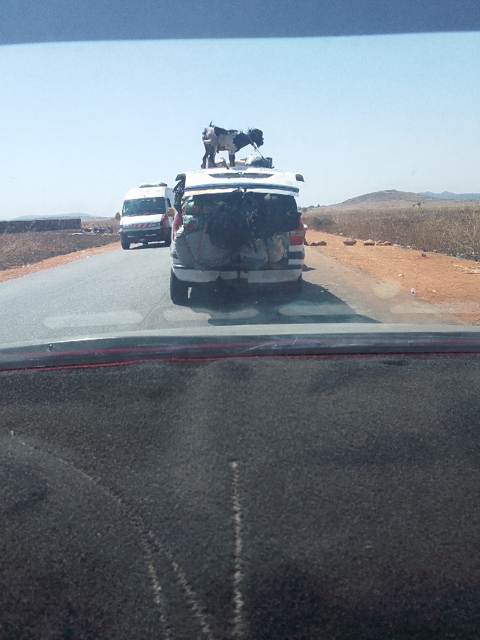 The image depicts a rural transportation scene observed from inside a vehicle, looking forward over a dark grey dashboard. In the midground, a white SUV/minivan travels on a paved road. Its rear hatch is open and heavily loaded with assorted bundles and bags. A black and white goat stands tethered on the vehicle's roof rack. Ahead of this SUV, a white commercial van, possibly a Mercedes Sprinter, proceeds in the same direction. The road is asphalt, flanked by unpaved, dry, reddish-brown shoulders with scattered rocks and sparse, low-lying vegetation. The background features a barren, arid landscape under a clear, light blue sky, with a low hill visible on the horizon to the right and faint distant structures to the left. The scene occurs during daylight hours. No individuals are visible. The location is an unspecific, open rural route within the general "Unknown, Unknown" region.