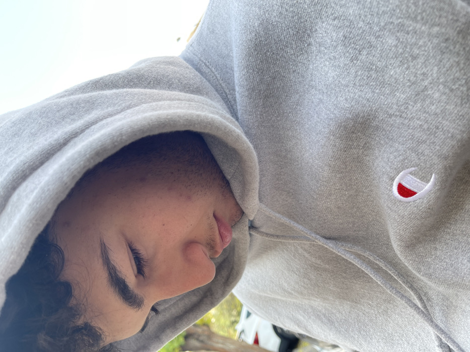 A young male subject, appearing to be in his late teens or early twenties, is depicted in an outdoor setting within Sarouja Municipality, Syria. The subject is shown from the chest up, with his head tilted downwards and his gaze directed towards the lower left of the frame. He has dark, curly hair partially visible beneath a light grey hooded sweatshirt (hoodie), which he is wearing with the hood pulled over his head. A white and red "Champion" logo is embroidered on the left chest area of the sweatshirt. Visible facial features include dark eyebrows, light stubble on his chin and jawline, and slightly parted lips. The background is out of focus, showing blurred green foliage and a portion of a white vehicle to the subject's left, with a light blue or white indistinct area to his upper right.