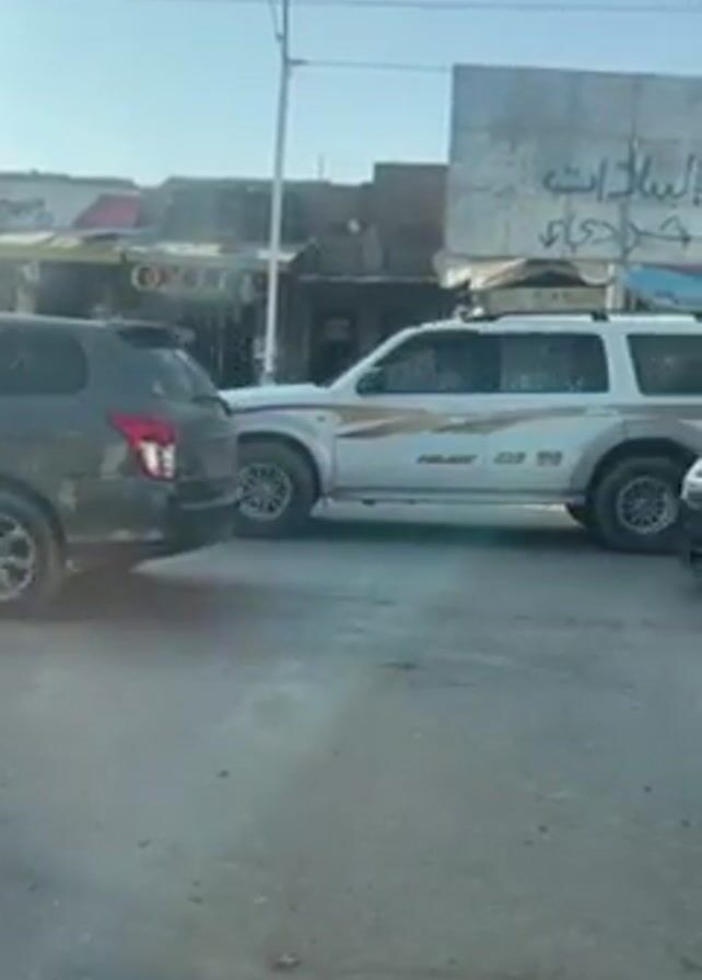 street scene with several vehicles moving through the frame. There's a gray Toyota Corolla wagon, a white Ford Everest, and a dark-colored compact car visible. People are gathered around a storefront with tires displayed. Another auto-rickshaw is also visible in front of the stores. There is graffiti on the front of the building next to the storefront. The environment appears to be a busy commercial area with buildings along the street. The weather appears sunny.