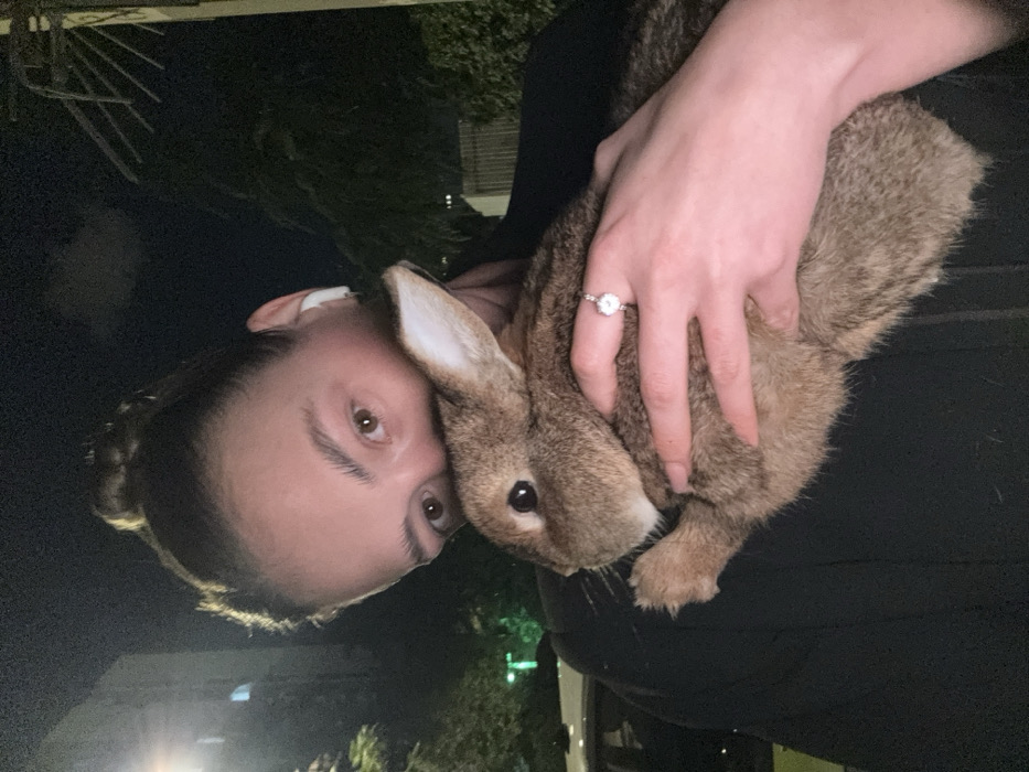A person cuddles a large brown rabbit. The person has dark hair and wears a black shirt. Their cheek rests against the rabbit's head. One hand encircles the rabbit, visible on the animal's back, adorned with a ring. The backdrop is a dark outdoor setting, with glimpses of foliage and a distant street lamp adding to the ambiance.