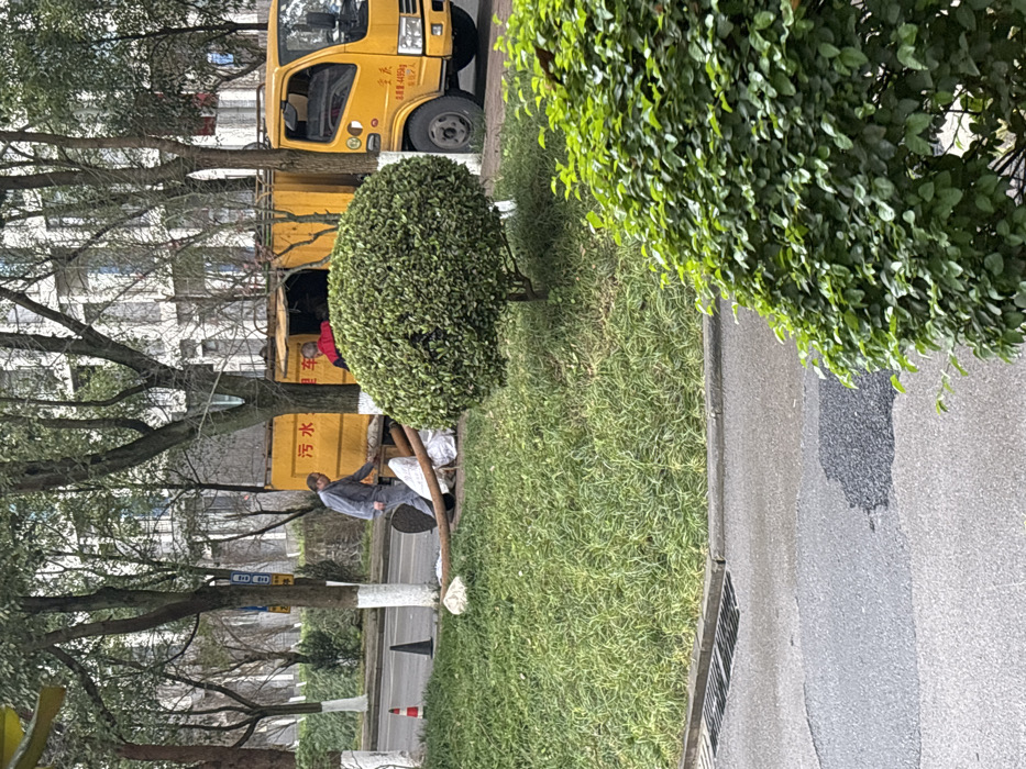A yellow sanitation truck is parked on the side of a street. A man in grey is positioned near the truck, potentially working on it. Another man in red is visible inside the truck. Green trees and bushes line the street, partially obscuring the truck and other elements. The road is asphalt with visible patches of dampness. A grassy area separates the road from the truck and trees. Cones are present in the scene, perhaps marking a work area.