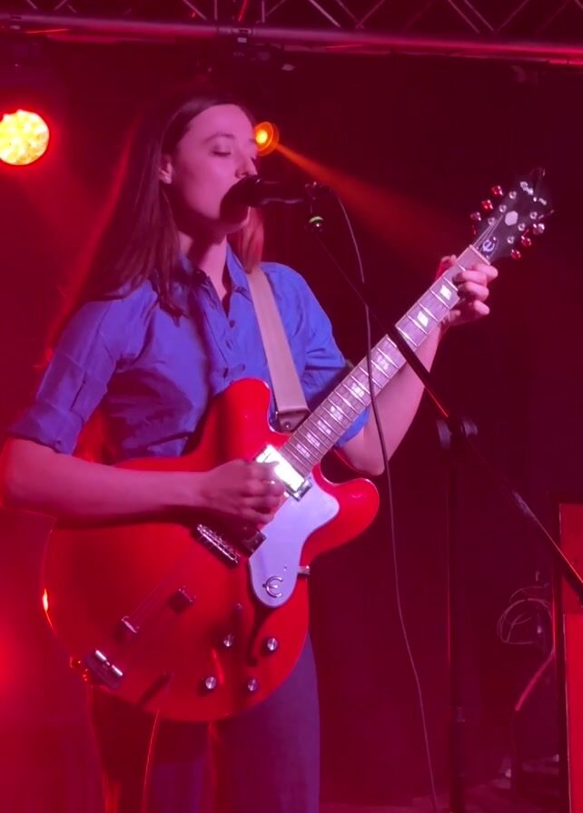 A woman is seen on a stage, lit with red lighting, singing into a microphone while playing a red semi-hollow body electric guitar. She is wearing a blue collared shirt and dark pants. A guitar strap runs over her shoulder. The stage has metal trussing above. There are lights to the side of her, and a microphone stand to her right.
