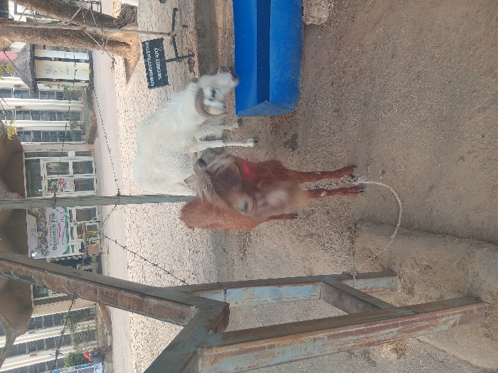 Two goats are near a building; one is white with large curved horns, and the other is reddish-brown. They are tethered with chains to a metal structure, resting on a sandy ground. A blue structure is positioned nearby, and a sign that says "Administrative Secret Way" is posted behind the white goat. Buildings and structures are visible in the background.