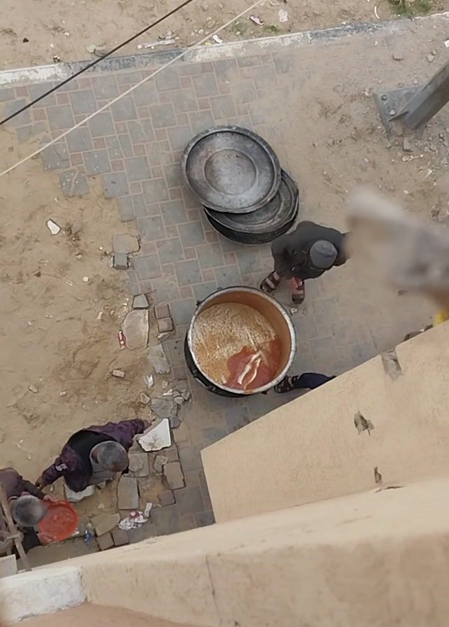 From a high angle, the video shows four people gathered around a large, silver, industrial-sized pot filled with a light-colored food mixed with a red sauce. The pot is on a tiled area next to a building. To the left of the pot are several large, flat, grey metal lids stacked on top of each other. One man is wearing a dark jacket and is holding a metal bowl. Another person, wearing a yellow jacket, is helping him fill the bowl from the pot. A third person, wearing a dark jacket, is standing near the pot. The fourth person, in a purple jacket, is seated on the ground next to the building. The surrounding area is sandy and littered with debris. A metal pole is visible on the left of the frame. The camera's perspective is looking down, likely from a high floor of the adjacent building.