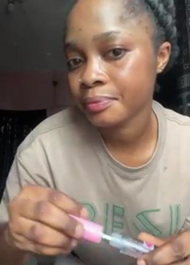 A young woman with dark braided hair and a nose piercing applies lip gloss