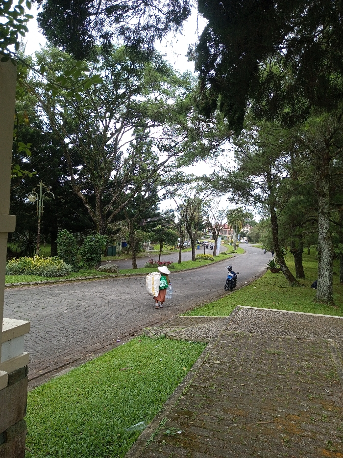 A paved road curves into the distance, lined with trees and grassy areas. A person wearing a conical hat and carrying a large white package walks along the road's edge. A motorcycle is parked on the grass nearby. The scene is captured from a slightly elevated position, with part of a building visible in the lower left and lush greenery forming an overhead canopy. The overall impression is one of a quiet, well-maintained neighborhood street.