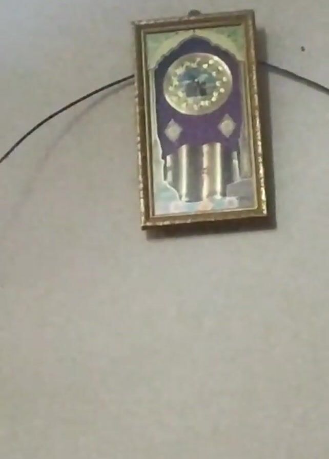framed picture hanging on a light grey wall. The frame is gold and the picture appears to be of a building with a clock in the background. A black wire hangs from the top left corner of the frame and continues out of view. The image is slightly out of focus.