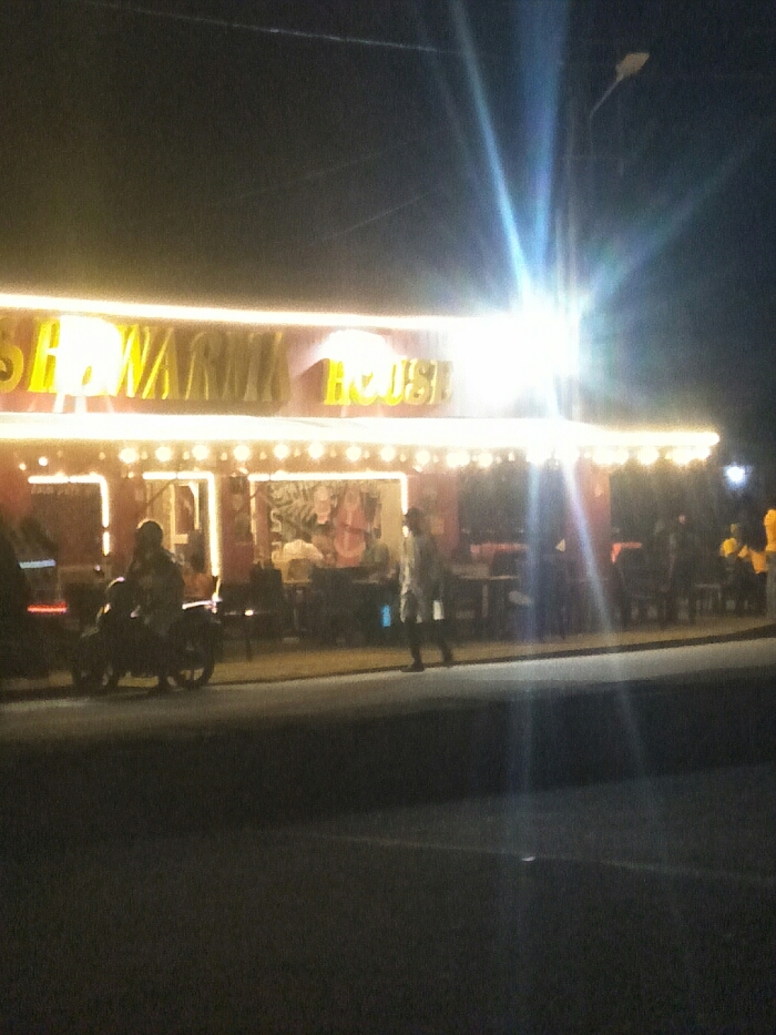 - "The image displays a nighttime street scene in Cotonou, Benin, focusing on a commercial establishment identified by a brightly illuminated yellow sign reading "SHAWARMA HOUSE" against a reddish facade" by FM-YhEN42, licensed under CC BY 4.0