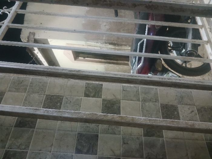 A low-angle shot through a weathered metal railing reveals a tiled floor in shades of gray and beige. Beyond the railing, a glimpse of the outdoors shows a parked motorcycle with a maroon body. The background also displays a section of a building exterior with light-colored walls. The overall composition gives a sense of depth, with the railing acting as a foreground barrier.