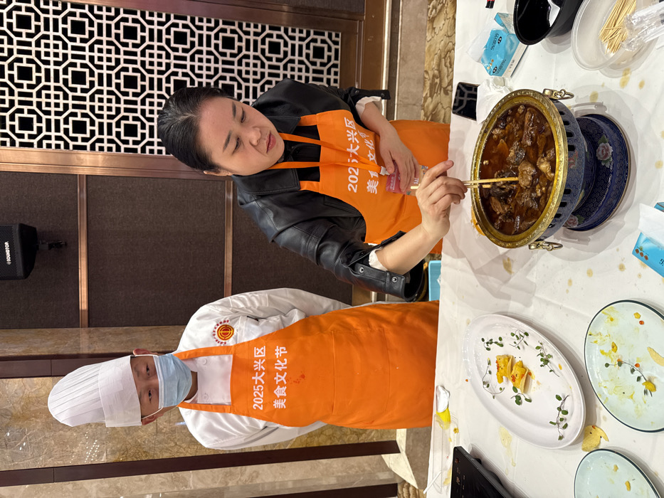 An indoor scene captured at the "2025 Daxing District Food Culture Festival" in Daxing District, China, shows two individuals around a white-tablecloth-covered table