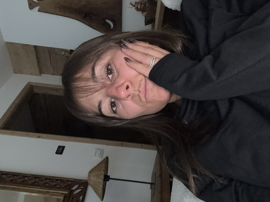 A brunette woman with bangs poses for a selfie. She wears a dark-colored long-sleeved top and a ring on her hand. Her hand is positioned against her cheek, and she makes a pursed-lips expression. The background includes a doorway, a lamp, decorative wall art, and a white surface, possibly a bed or couch. The image is slightly rotated.