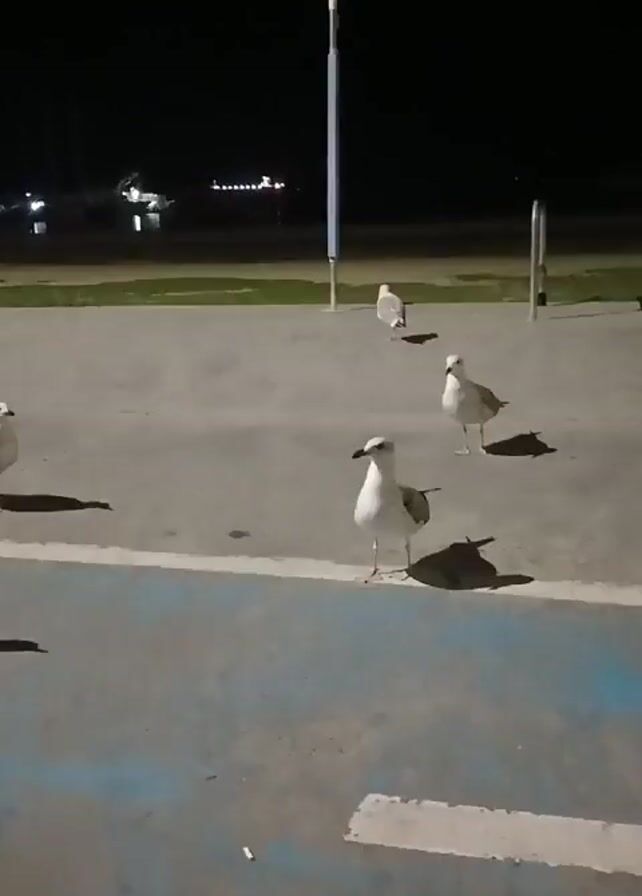 group of seagulls on a paved surface at night. There are several seagulls standing on the ground, illuminated by a streetlight. In the background, there are lights from buildings or boats in the distance. A hand enters the frame, and the seagulls start moving towards the person.
