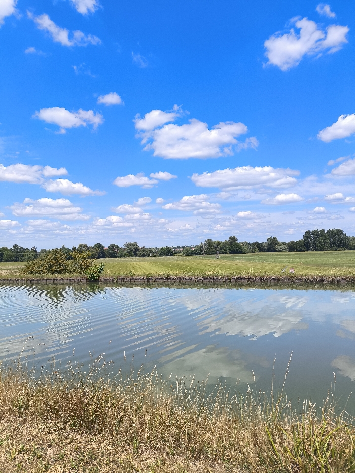 The image displays an outdoor landscape scene in Waltenheim-sur-Zorn, France, under a bright blue sky populated by scattered white cumulus clouds. A calm body of water, likely a canal, occupies the middle ground, its surface exhibiting numerous small ripples and reflecting the overhead sky and clouds. The foreground, on the near bank, consists of dry, brown, and yellowish unmaintained grass. The opposite bank features a wide, level expanse of mown green grass or field with visible mowing stripes. A dense cluster of green and yellowish foliage, possibly bushes, is present on the far left of the opposing bank. In the background, beyond the mown field, a treeline of various deciduous trees is visible, with indistinct light-colored structures or a distant town faintly discernible on the horizon. No individuals, animals, or discernible human activity are present in the scene.