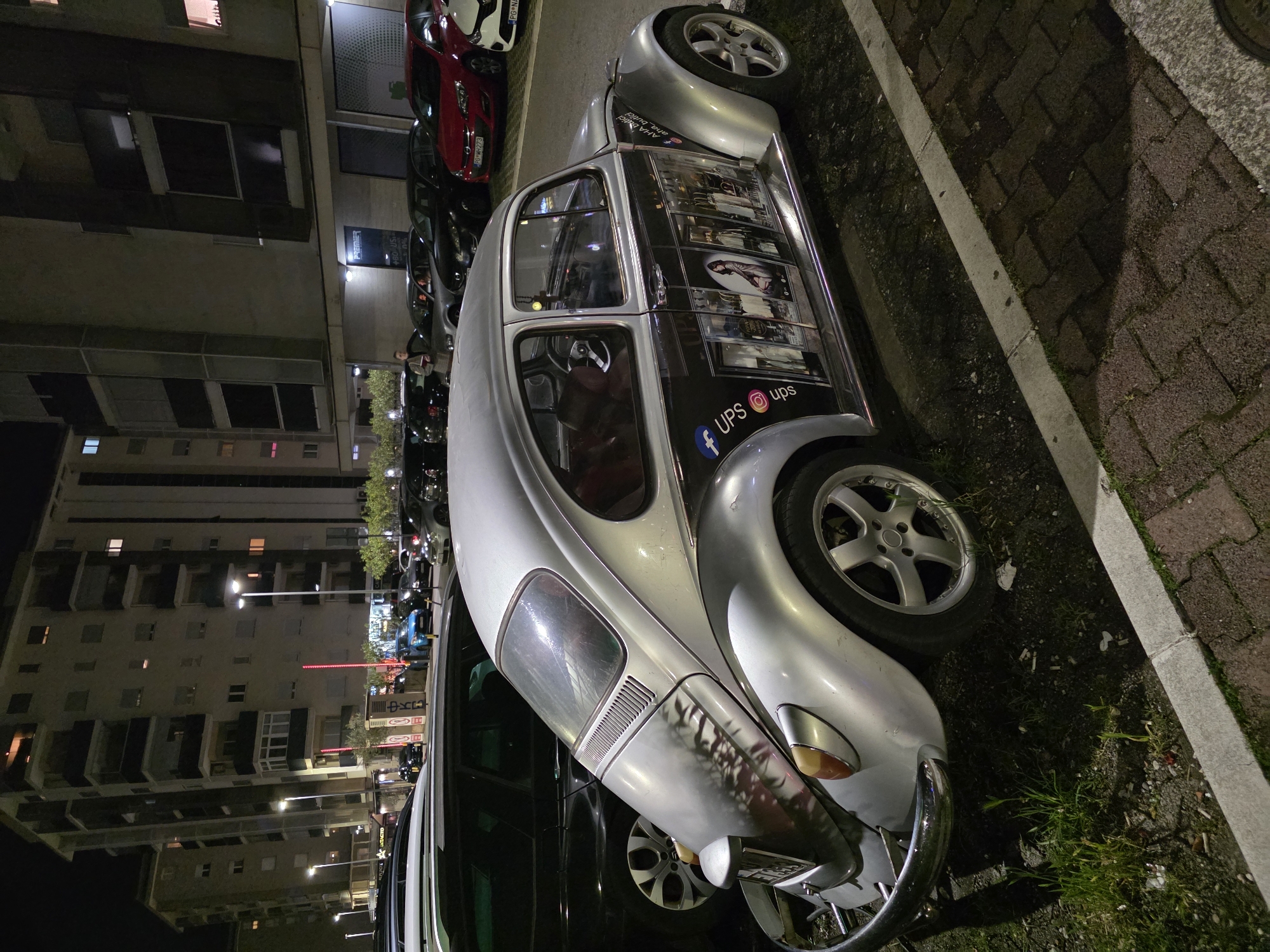 The image depicts a nighttime urban scene in Podgorica, Montenegro, focusing on a silver Volkswagen Beetle (classic model) parked diagonally to a paved street or parking area. The Beetle features custom multi-spoke wheels and a black vinyl wrap along its side, adorned with images resembling boutique display windows showing clothing and a seated female figure. Social media icons (Facebook, Instagram) and text reading "UPS" and "aha_sutici" are visible on the wrap. The vehicle's rear window is dusty, and it has a tubular chrome rear bumper. Its interior shows red seating. The Beetle is parked alongside a concrete curb next to a narrow strip of dirt and sparse grass containing several discarded cigarette butts. To its immediate left is a dark-colored station wagon. In the background, numerous other vehicles are parked, including a red hatchback with the Montenegrin license plate "PG MH273" and a white hatchback with "PG NA342," both indicating Podgorica. Behind the vehicles, multi-story buildings with balconies and illuminated windows are visible, lining the street. Streetlights illuminate the scene. A commercial establishment on the ground floor of one building displays a "PREMIER" sign, while another sign reading "KONTAKT" and red vertical light strips are visible further down. One individual, dressed in a light coat, is visible standing near a grey parked car in front of the "PREMIER" establishment. The ground surface consists of brick-patterned pavers and asphalt.