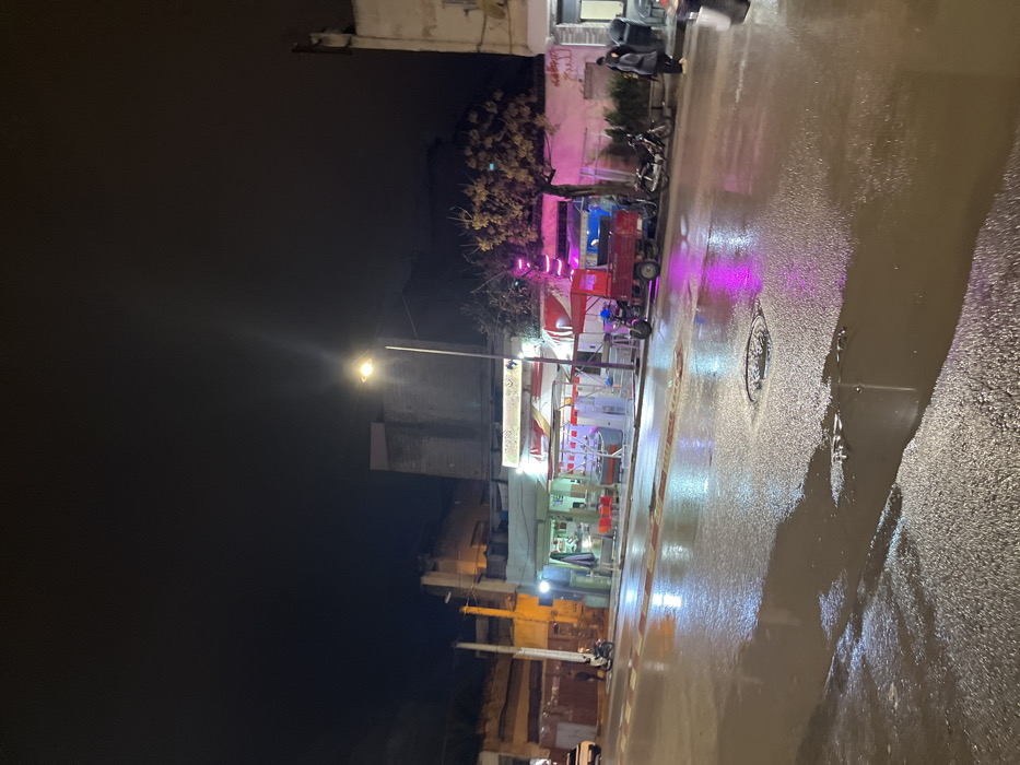 A nighttime urban scene after rain