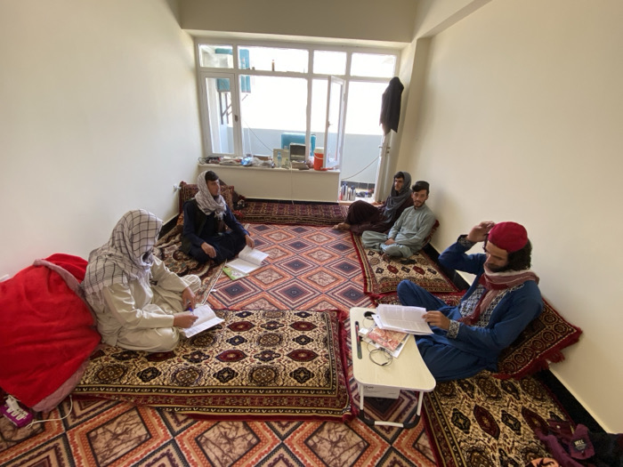 Five individuals are seated on patterned rugs on the floor within a room in Arghandab, Afghanistan