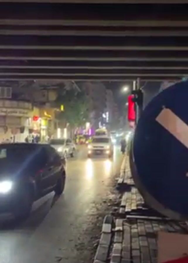 street scene at night, likely in a city, under an overpass. Several cars are visible, driving on a wet road. A street sign is partially visible on the right side of the frame. Buildings with lit signs and storefronts line the street in the background. There are a few people walking on the sidewalks. A traffic light is seen with a red light displayed. The scene is illuminated by street lights and headlights of the cars.