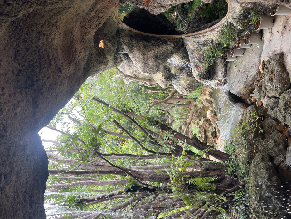 A stone cavern frames a view of lush greenery with thin trees. Water trickles down rocks into a shallow stream. An elevated walkway hugs the right side, adorned with potted plants. A circular mirror, embedded in the cavern ceiling, reflects the scene. Light streams into the cavern opening, illuminating the foliage.