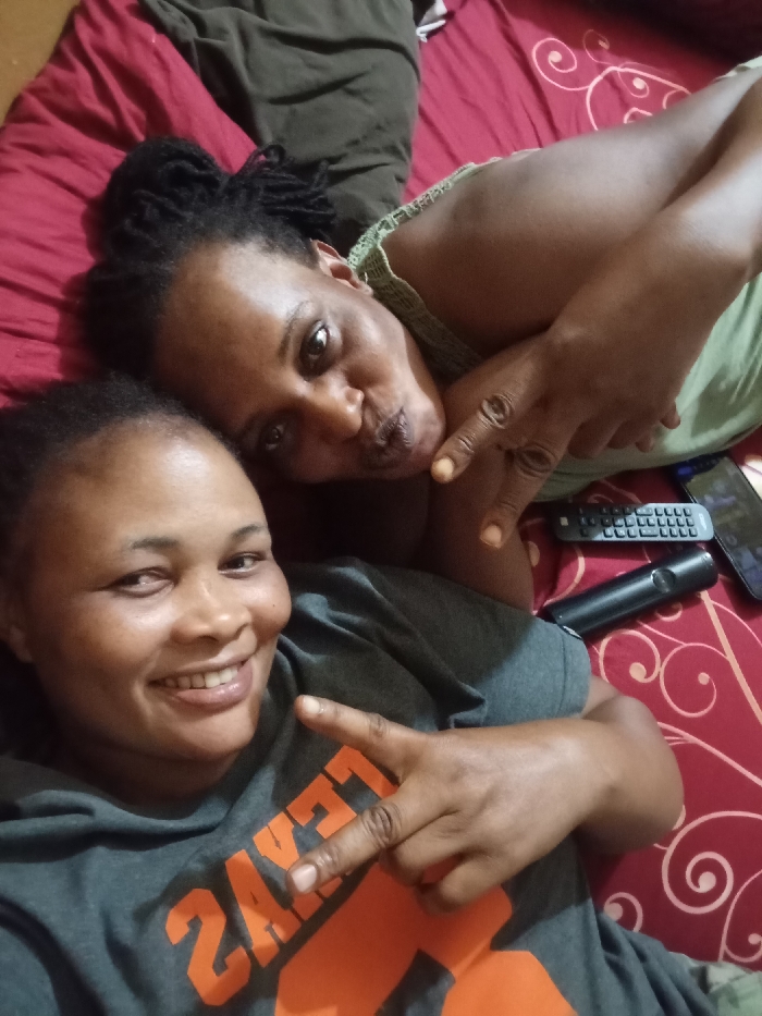 Two women pose on a red patterned bed. The woman in the foreground smiles broadly, wearing a gray shirt with orange letters, and makes a peace sign. The woman in the background pouts, also making a peace sign. A black TV remote and a cell phone lie on the bed next to her. One woman has her hair in locs, and the other has her hair pulled back. The background is a mix of red bedding and a dark-colored object.