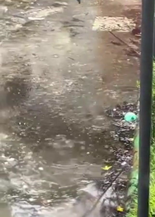 puddle on a paved surface during a rain shower. The water is murky and littered with debris like leaves, twigs, and a green plastic item. Raindrops are visible impacting the water's surface, creating ripples. A portion of a blue object is visible at the top of the frame. A black metal fence post is partially visible along the right edge of the frame, with some grass growing behind it.
