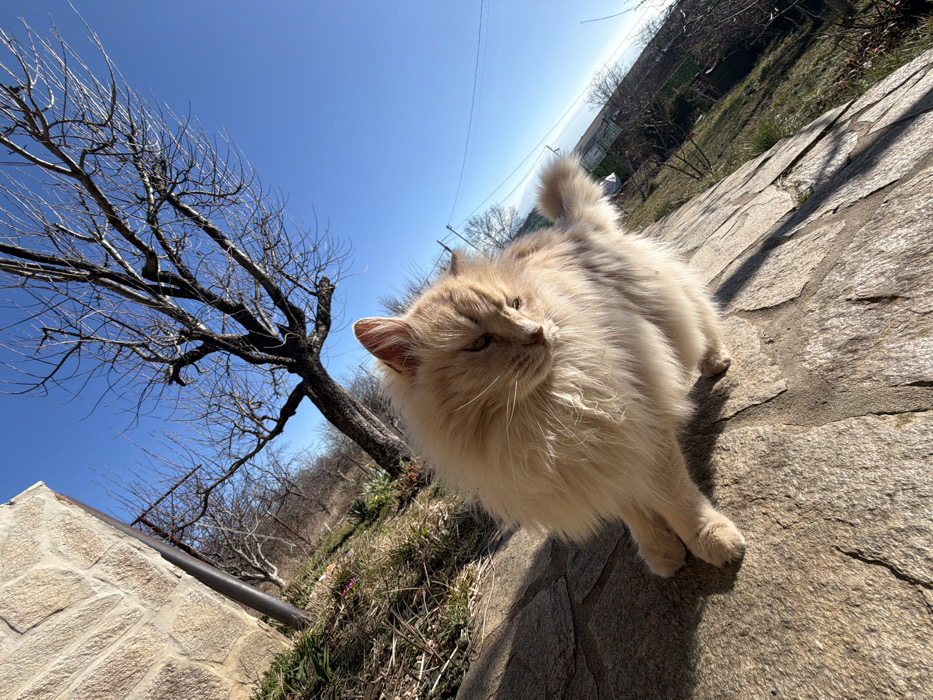 - "The image displays a long-haired feline, predominantly cream-colored with light ginger and greyish-brown highlights, seated on irregular stone paving in Katina, Bulgaria" by FM-xDLKn1, licensed under CC BY 4.0